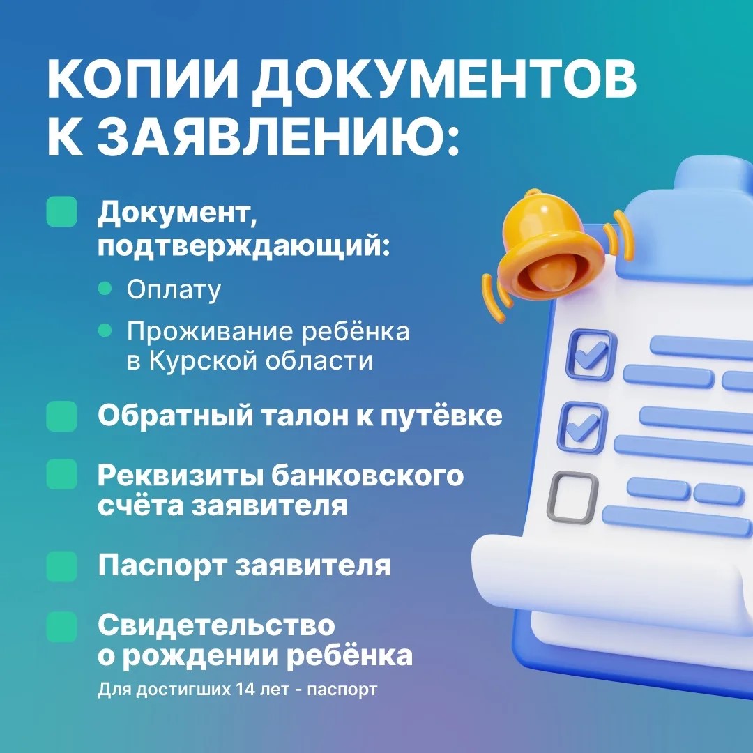 1. С 1 апреля по 1 июля купить путевку для своего ребенка в возрасте с 7 до 17 лет включительно в детский оздоровительный или санаторный лагерь Курской области, состоящий в Реестре организаций отдыха детей и их оздоровления Курской области на летний период (июнь-август).